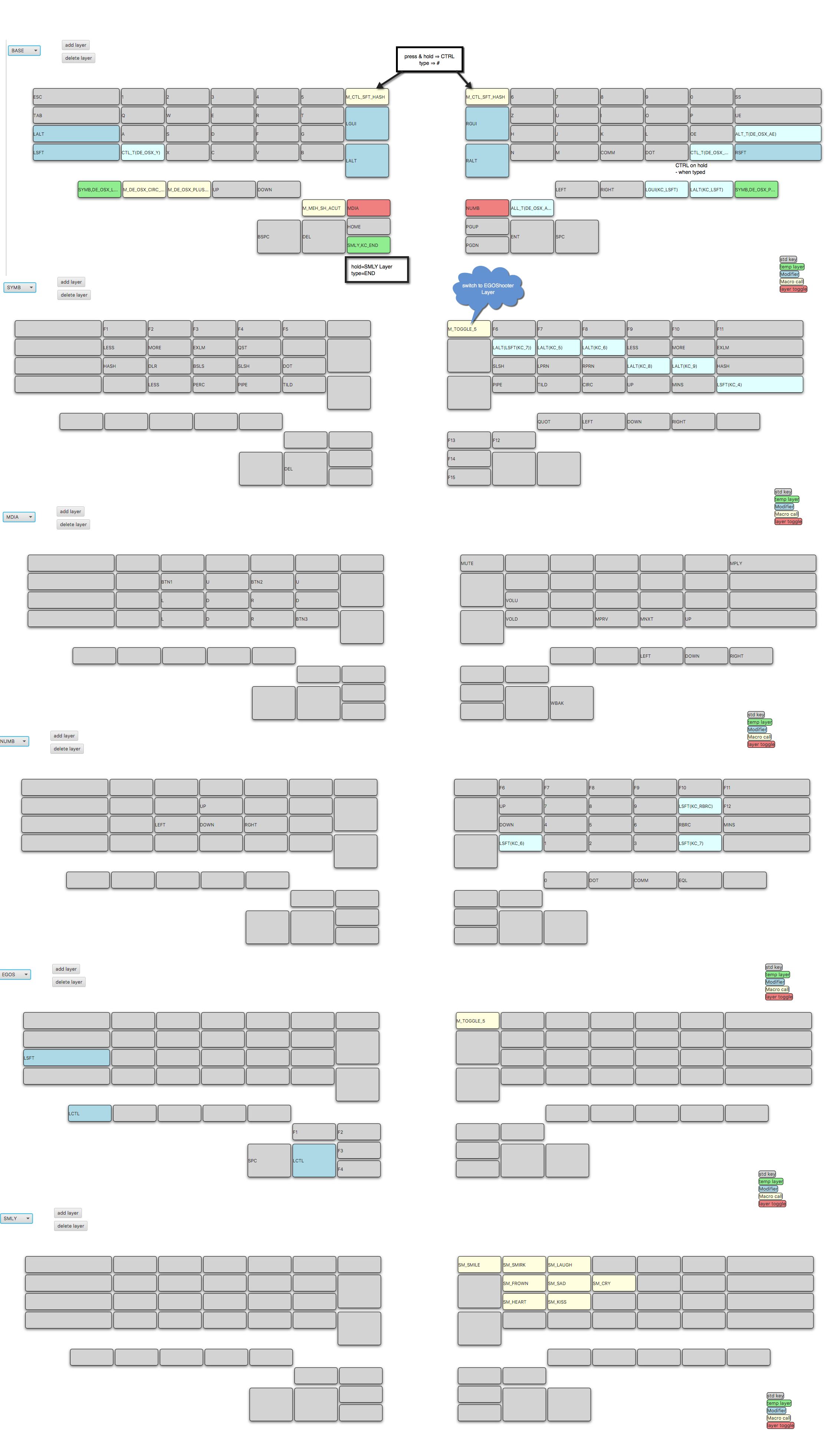 • several keycodes (like CTRL) are defined on multiple locations due to several reasons: sometimes I like to type for example CTRL on the right, sometimes on the left half of the keyboard, depending on the context. and I did not always know what to put at a certain key - too many keys there :) As already mentioned, this is a layout that works for me quite ok now. I will probably improve it over time (fortunately that is possible). It is opensource and available in github. Maybe you have additional ideas, how to improve things. Or you create your own custom firmware. But this is just the beginning...